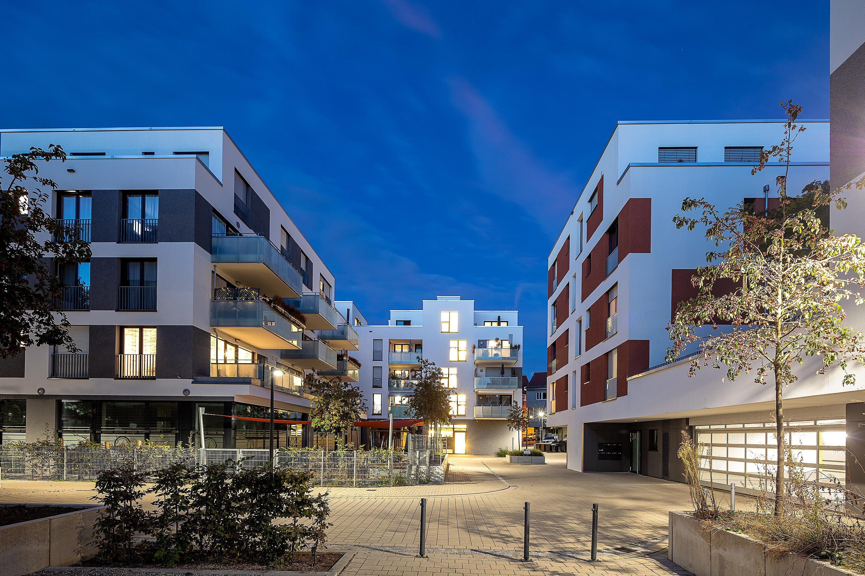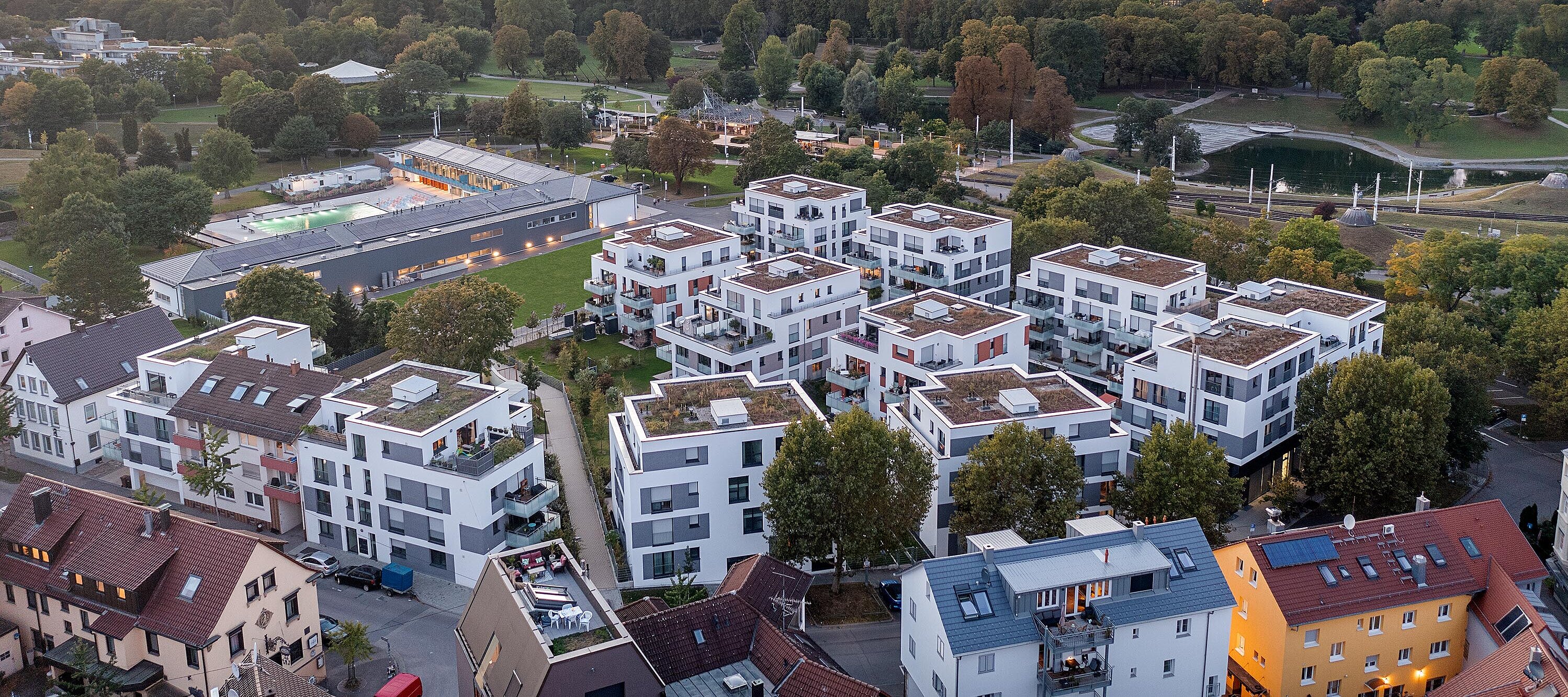 Das neue Stadtquartier Bad Berg liegt im spannenden Dreieck zwischen den Mineralbädern, dem Park, der Villa Berg, dem ehemaligen Sendesaal des süddeutschen Rundfunks sowie dem ehemaligen Parkgelände der Internationalen Gartenschau. Zwischen den 12 Mehrfamilienhäusern dient die grüne Quartiersmitte als Treffpunkt. Zusätzlich ergänzen gewerbliche Flächen, eine Kita und Gastronomieangebote das Nutzungsspektrum im Quartier sinnvoll und sorgen für eine lebendige und harmonische Nachbarschaft.