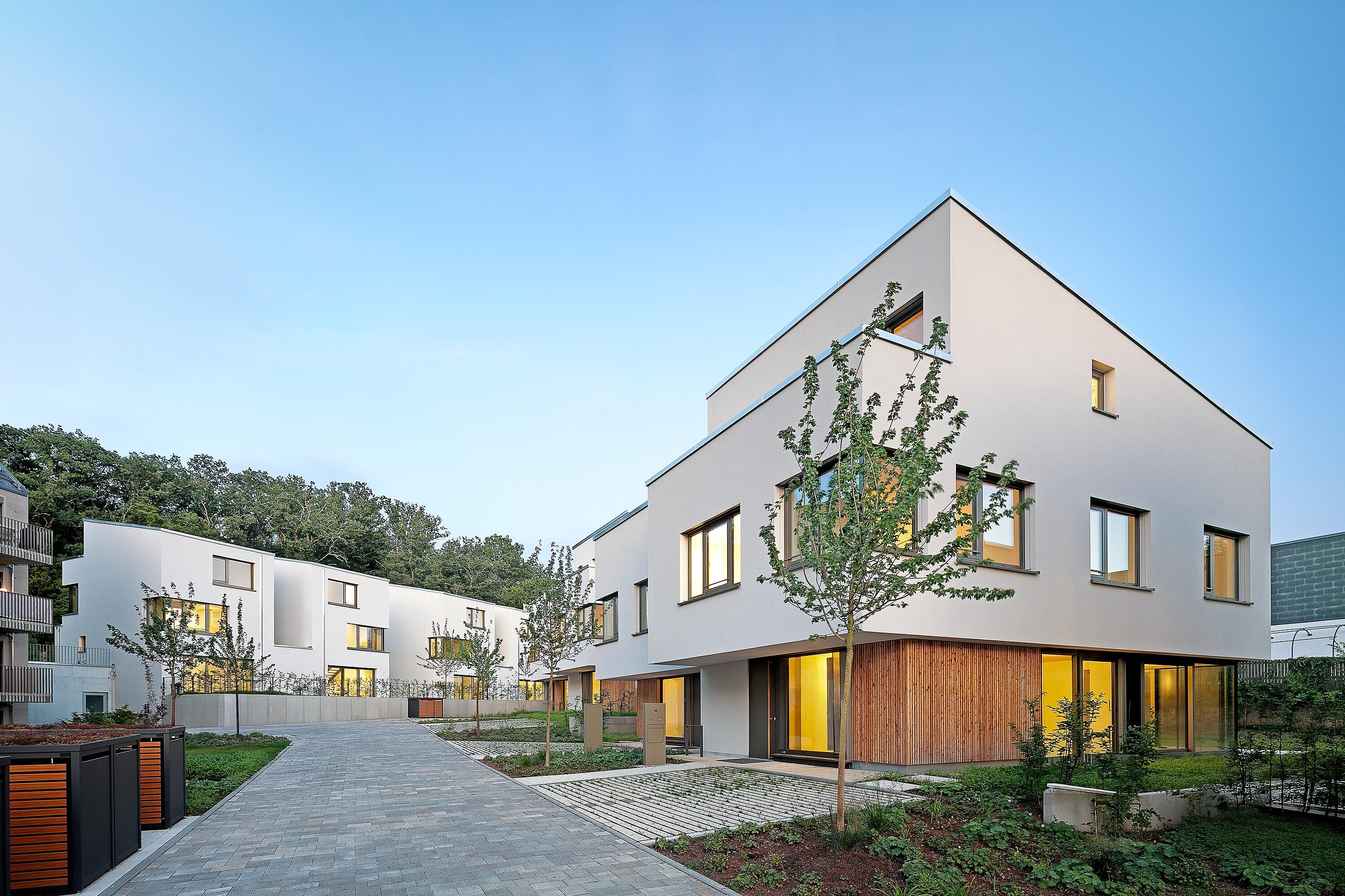 Holz prägt sowohl die Konstruktion als auch die Fassaden und schafft durch seine warmen Töne eine natürliche Verbindung zwischen Innen- und Außenraum. Terrassen, Grünflächen und eine abwechslungsreiche Bepflanzung formen ein Freiraumkonzept, das privaten Wohnkomfort mit einer lebendigen, nachbarschaftlichen Atmosphäre verbindet.