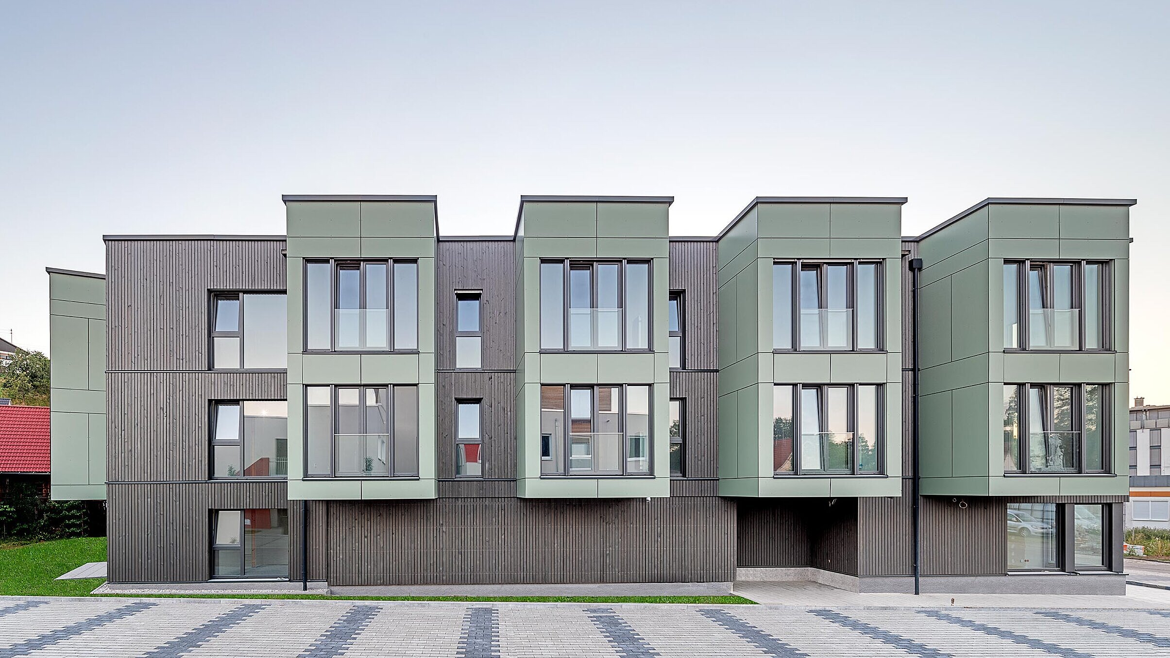 Der Neubau wurde in Holzständerbauweise errichtet – eine besonders ressourcenschonende Bauweise, die den Nachhaltigkeitsanspruch des Projekts hervorhebt. Sichtbare Holzelemente an Decken und in den Treppenhäusern schaffen eine warme, wohnliche Atmosphäre. Die Holzfassade wird durch Fassadenplatten an den auskragenden Erkern akzentuiert und verleiht dem Gebäude zusätzliche gestalterische Tiefe.