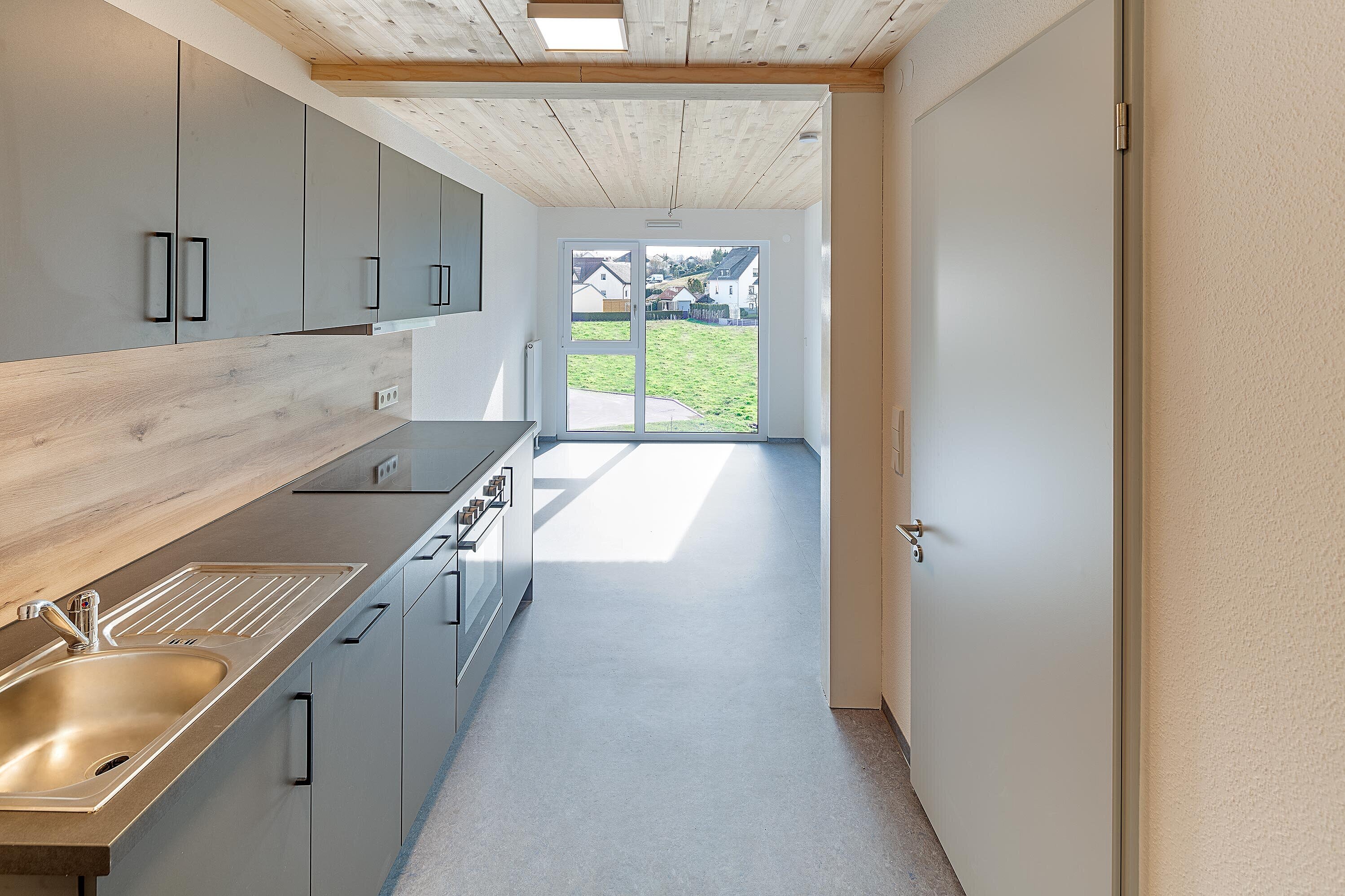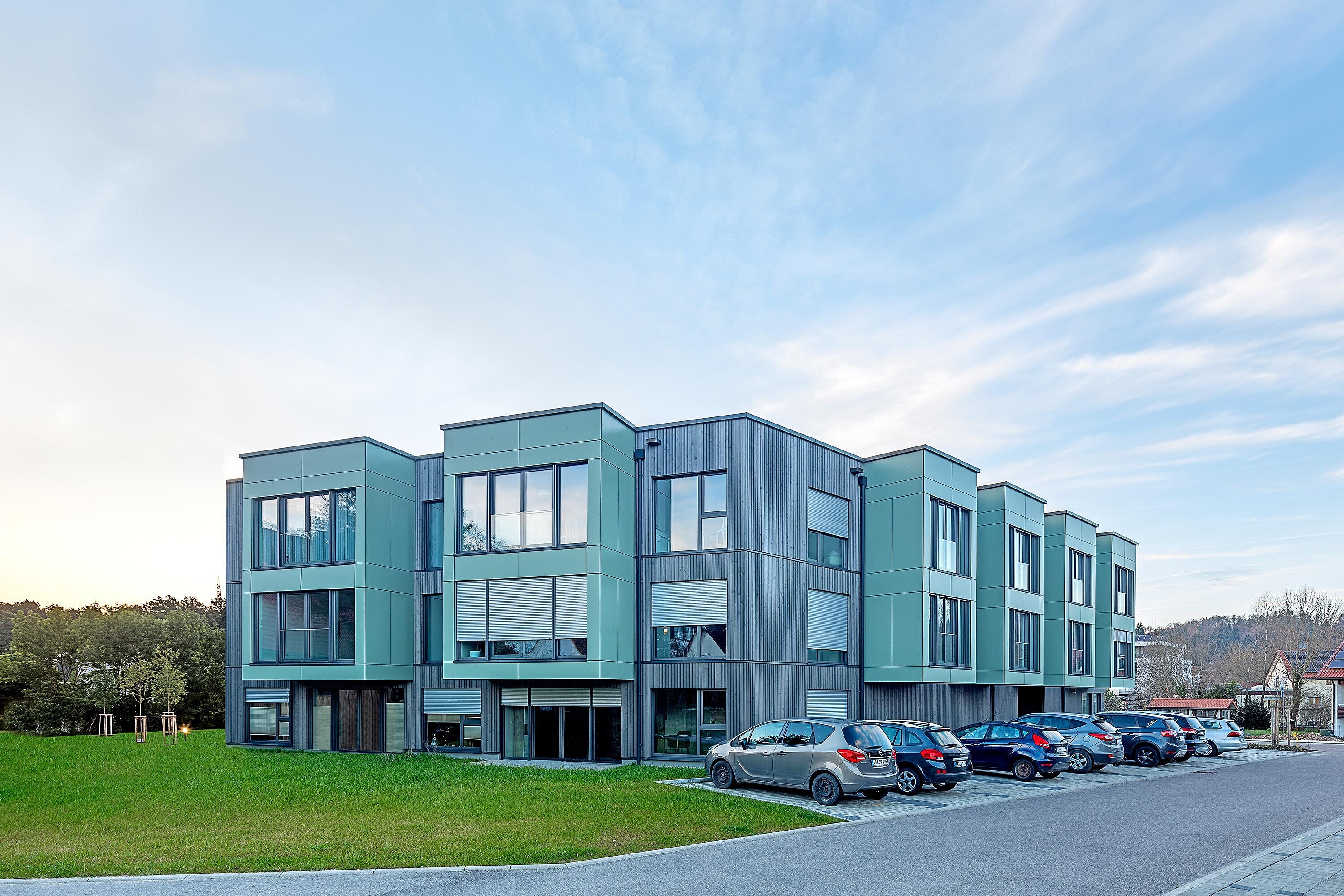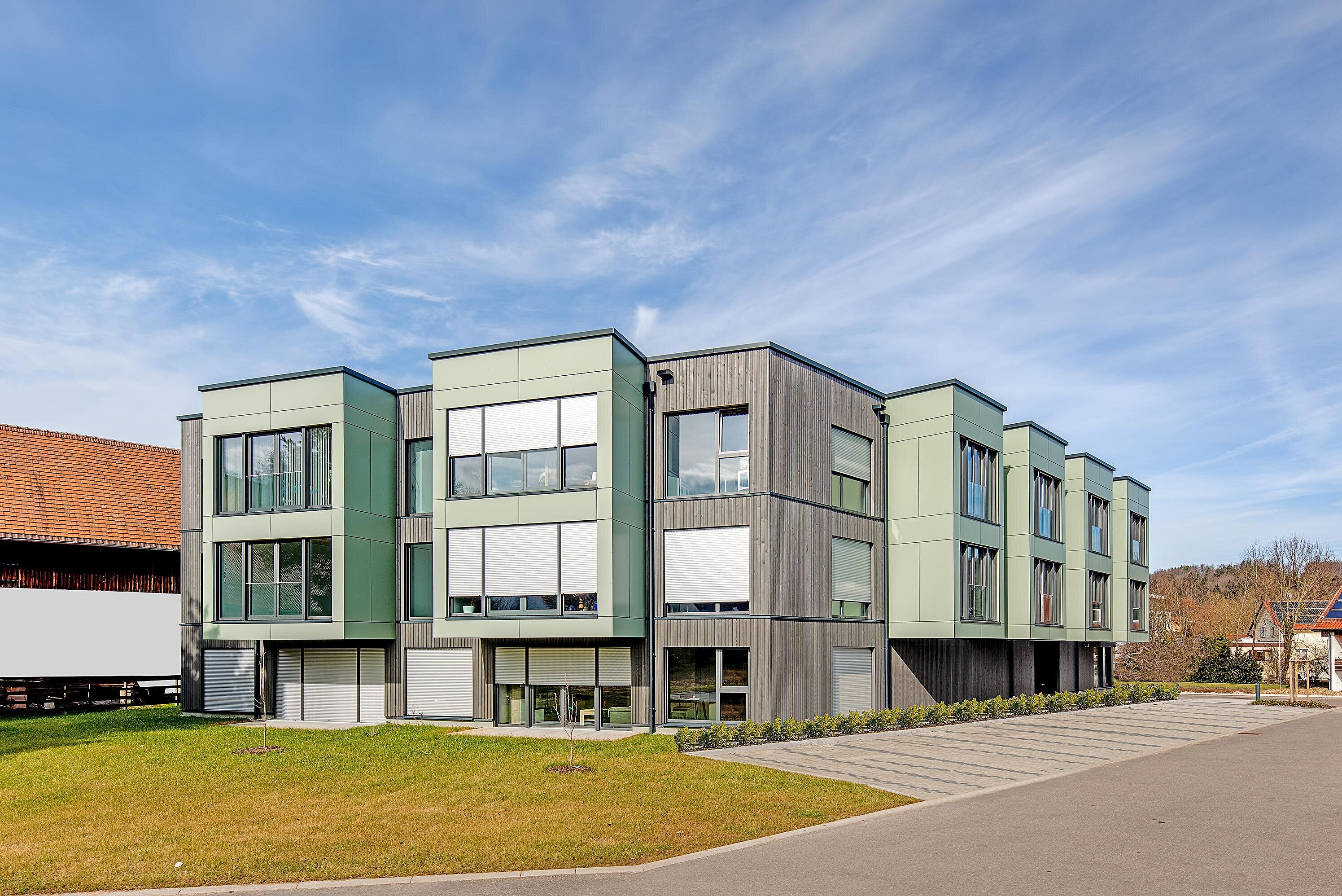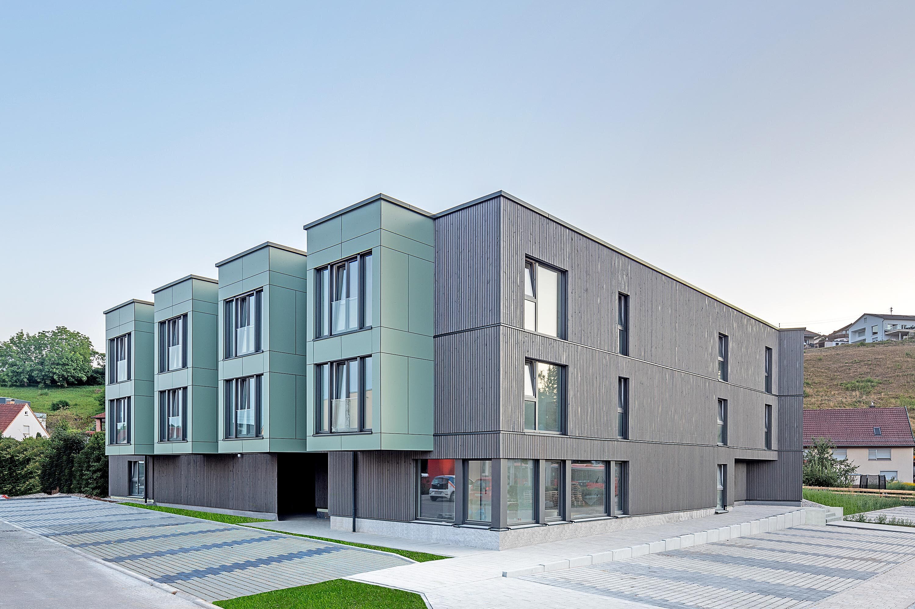 Mitten im Hallgarten, im Herzen von Abtsgmünd, entstand ein moderner Holzbau mit 26 barrierefreien Wohnungen sowie einem Gemeinschaftsraum im Erdgeschoss.