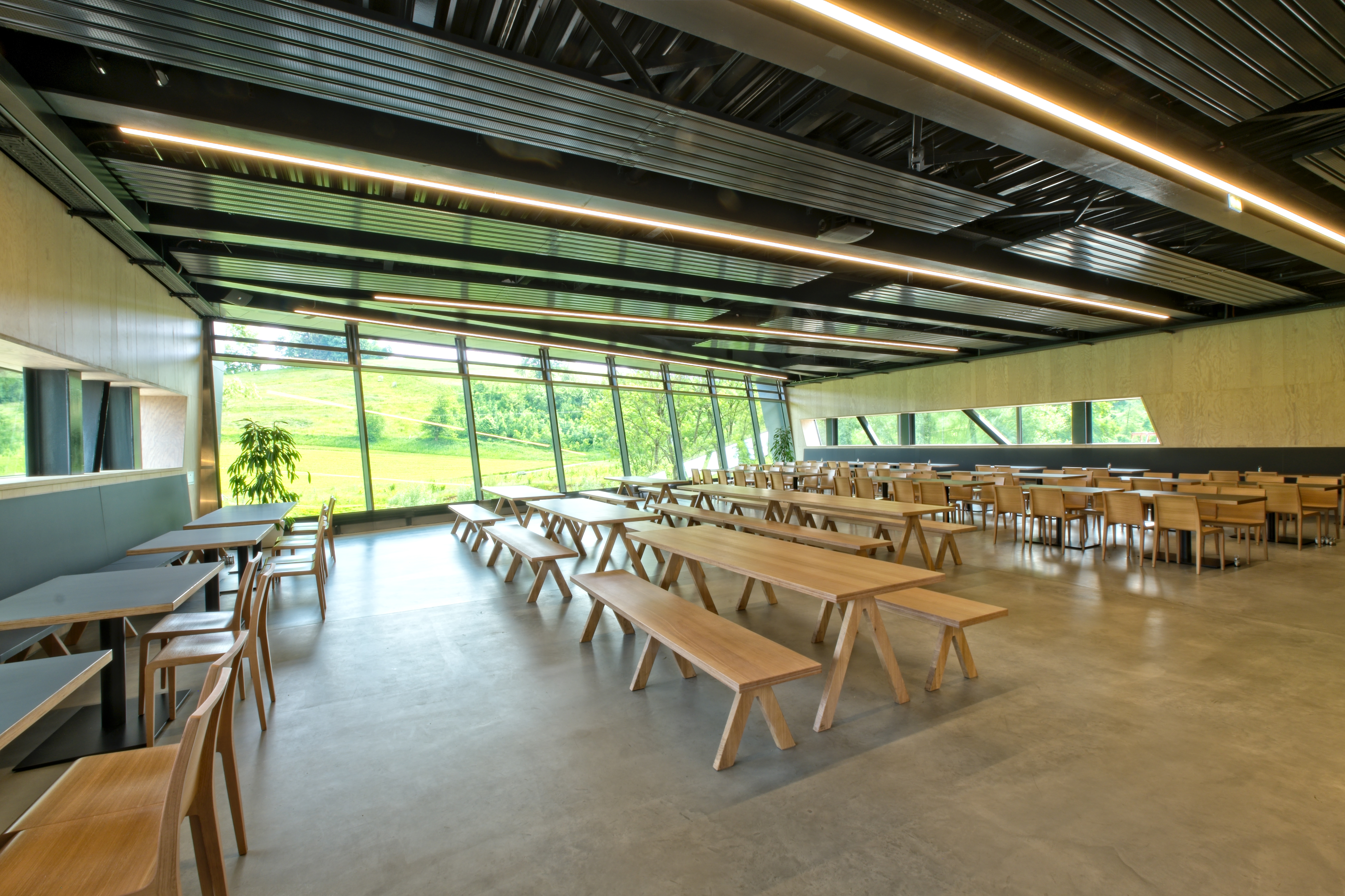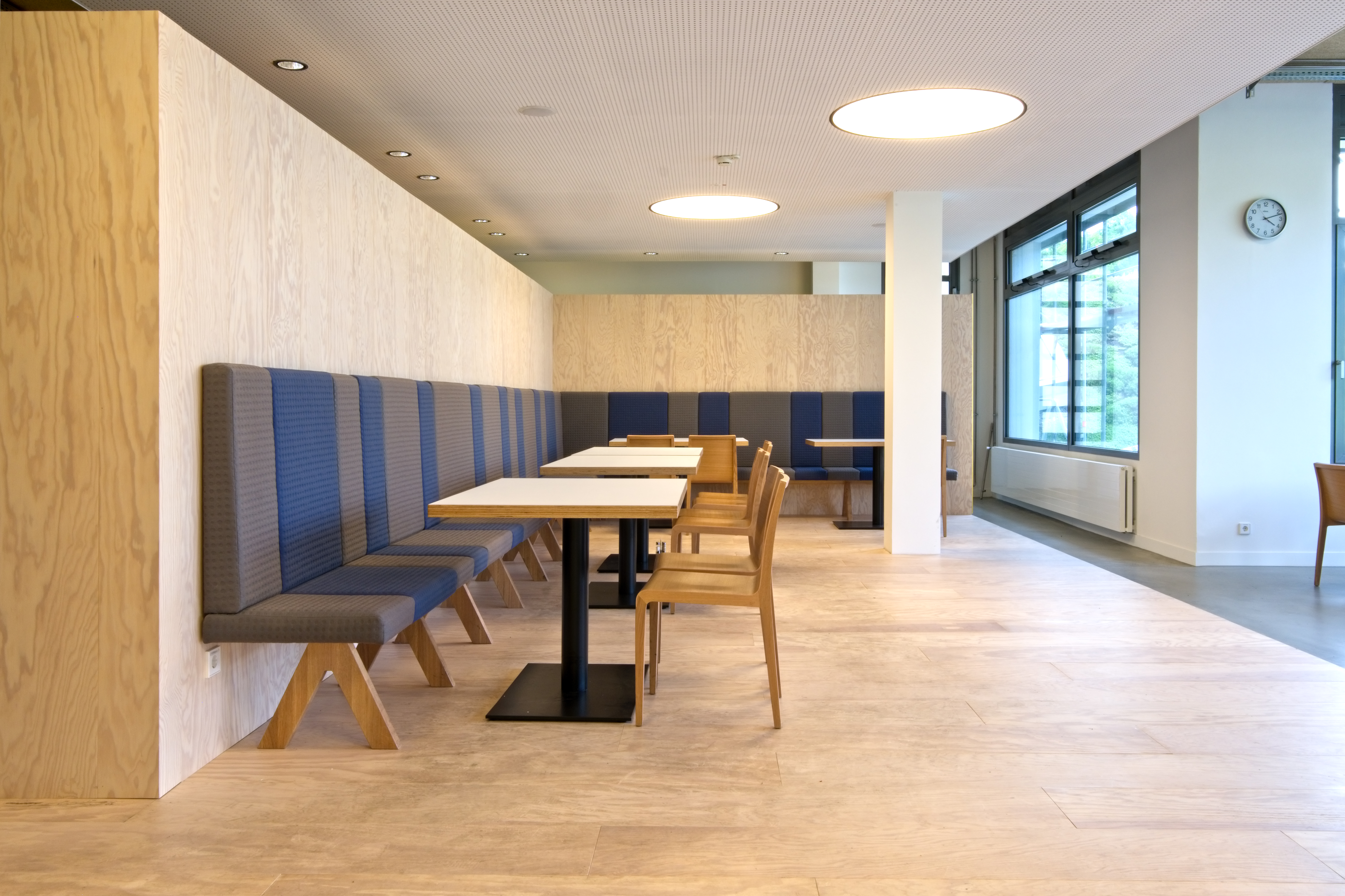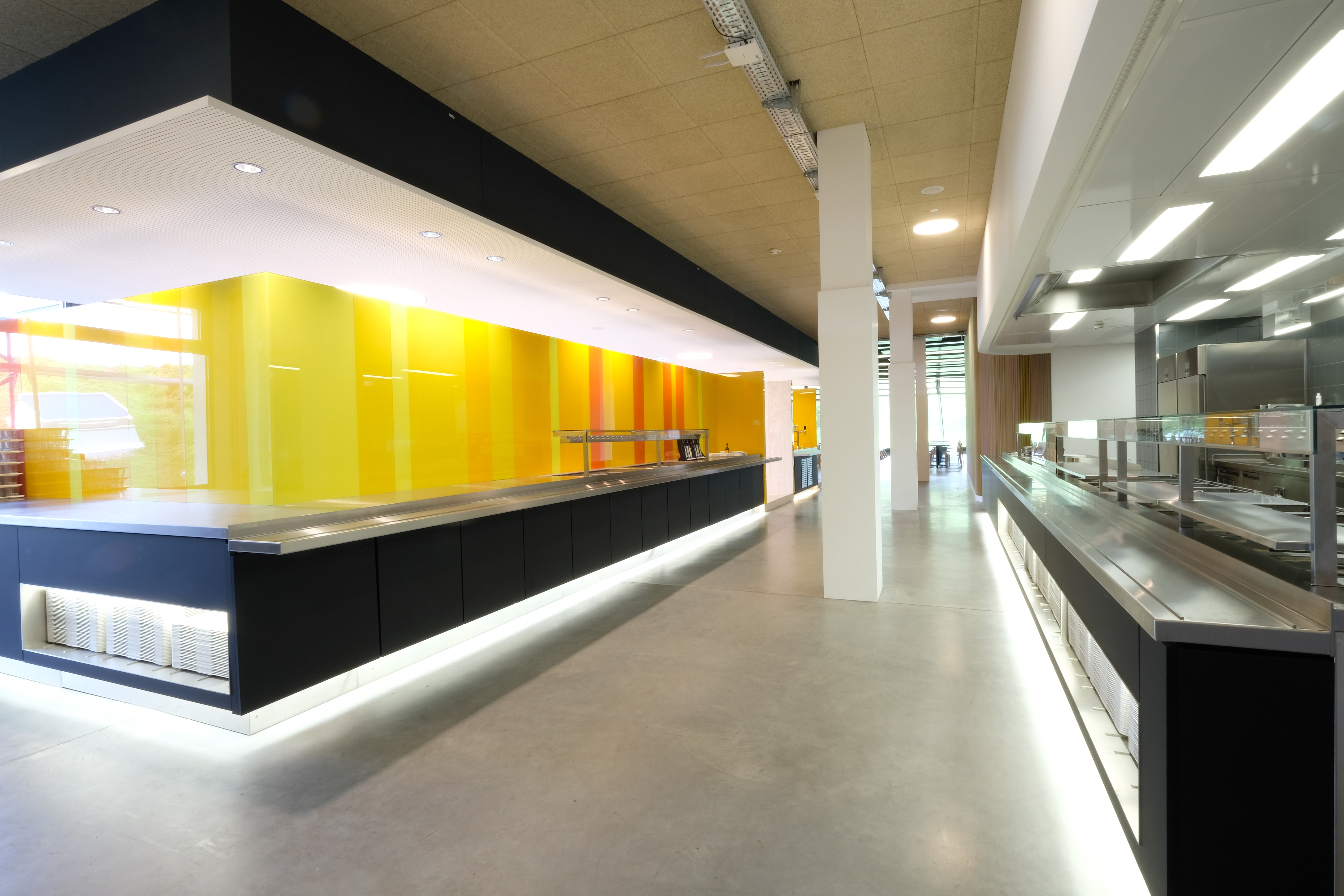 Abwechslung im Arbeitsalltag. Ähnlich aufgebaut wie ein Marktgelände gleitet die Ausgabetheke und das Buffet an den Mitarbeitern vorbei und schafft eine naturnahe Raumatmosphäre aus Holz sowie farbigen Glaspanelen in Südfrucht-Farben. Ein perfekt gelungener Ausgleich zum anspruchsvollen Arbeitsalltag.
