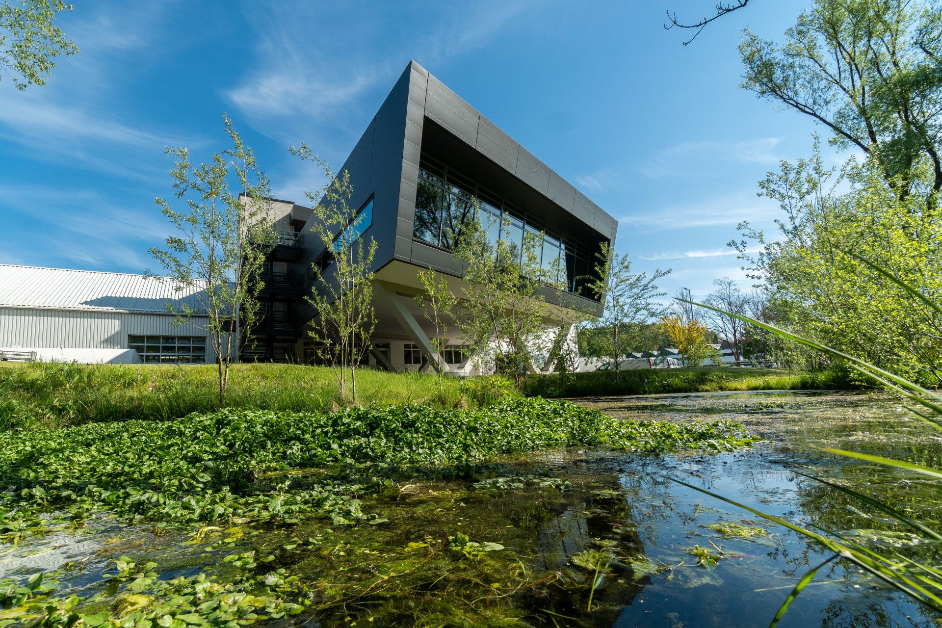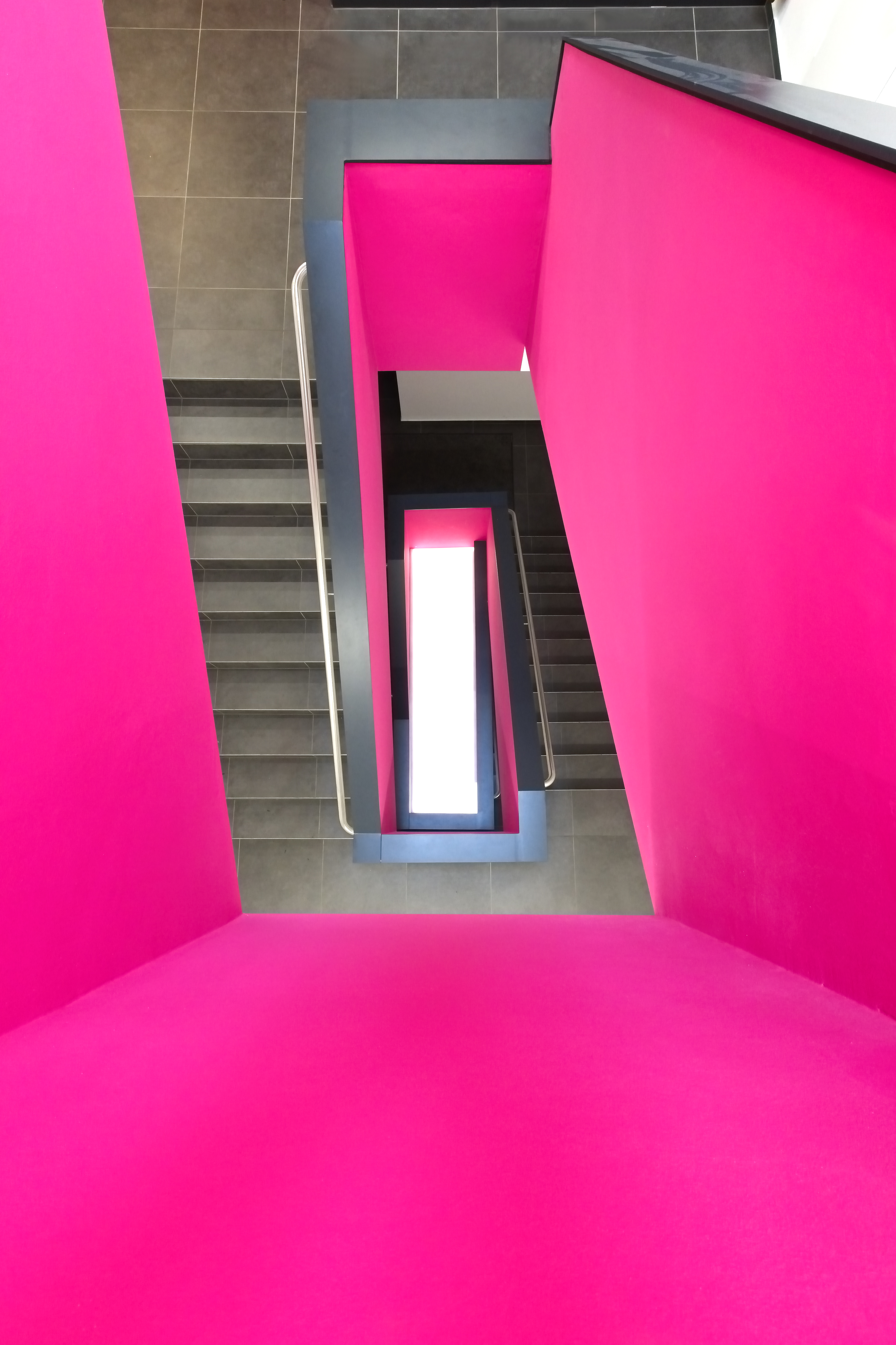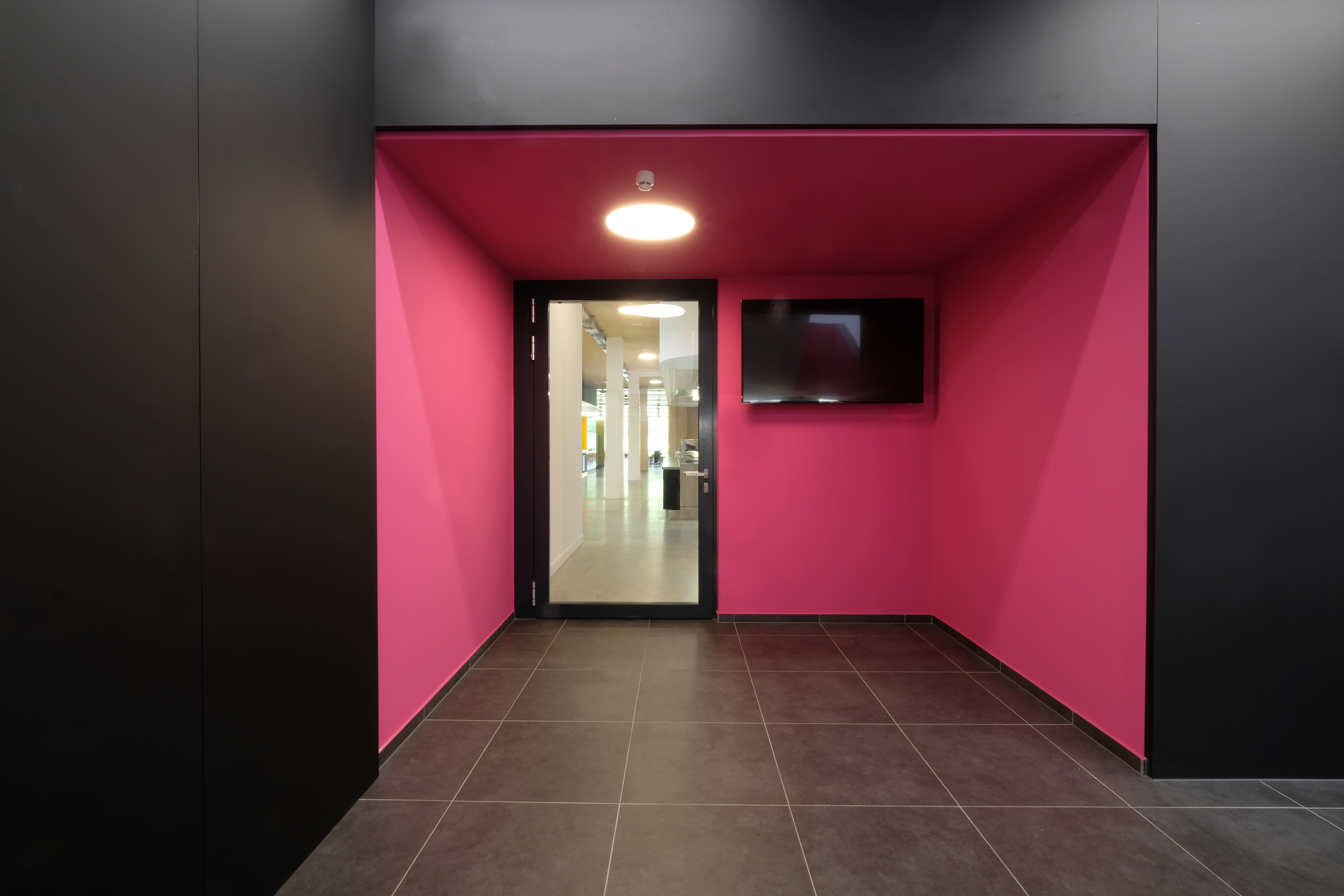 Abwechslung im Arbeitsalltag. Ähnlich aufgebaut wie ein Marktgelände gleitet die Ausgabetheke und das Buffet an den Mitarbeitern vorbei und schafft eine naturnahe Raumatmosphäre aus Holz sowie farbigen Glaspanelen in Südfrucht-Farben. Ein perfekt gelungener Ausgleich zum anspruchsvollen Arbeitsalltag.