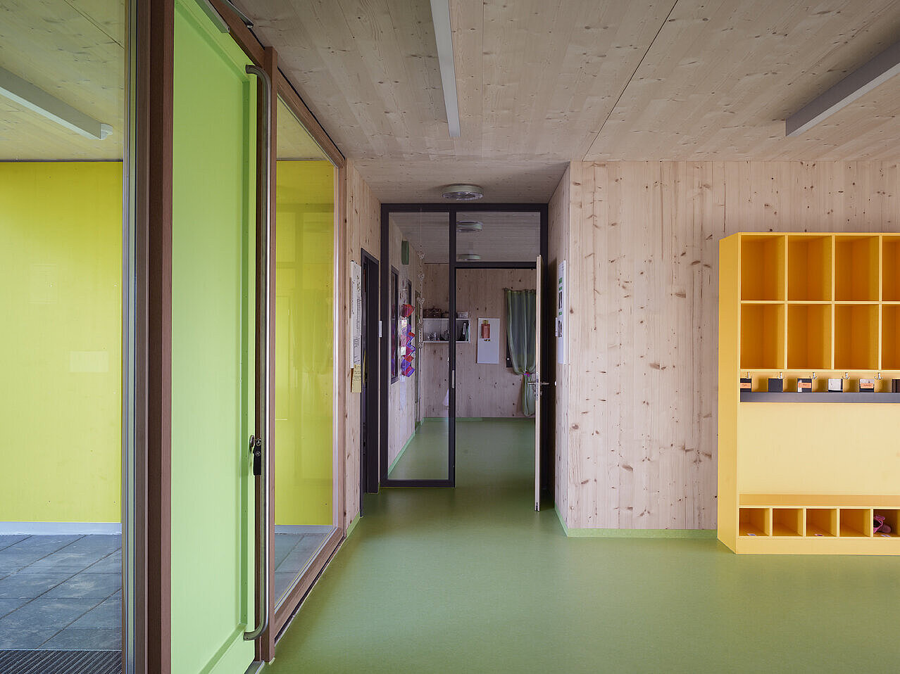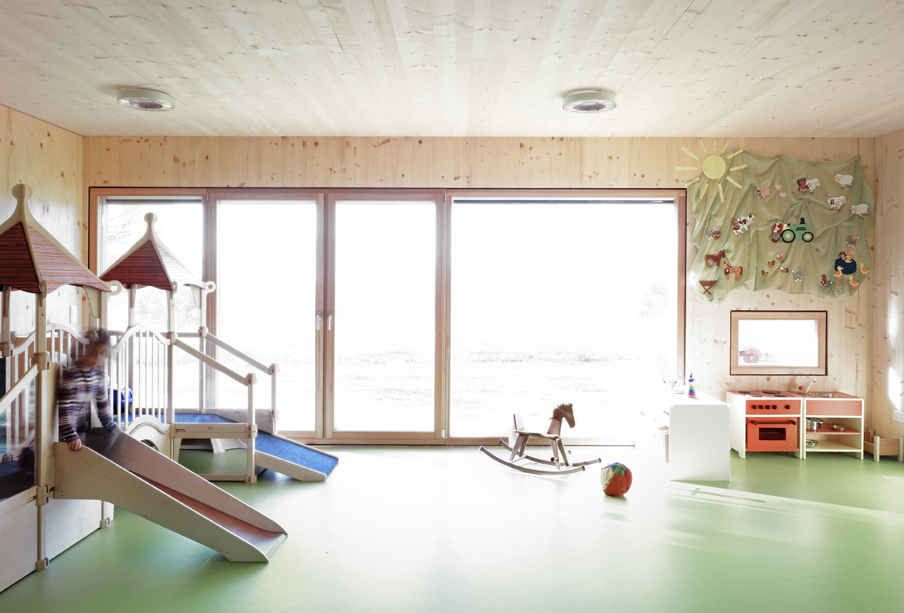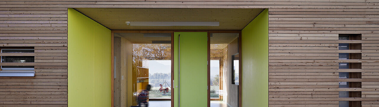 Aus dem ersten Eindruck des Bauplatzes heraus, der auf einer Anhöhe inmitten grüner Wiesen und Felder mit unverbaubarem Ausblick auf die Schwäbische Alb und die Drei-Kaiser-Berge liegt, entwickelt sich das gesamte Material- und Farbkonzept der Kinderkrippe.
