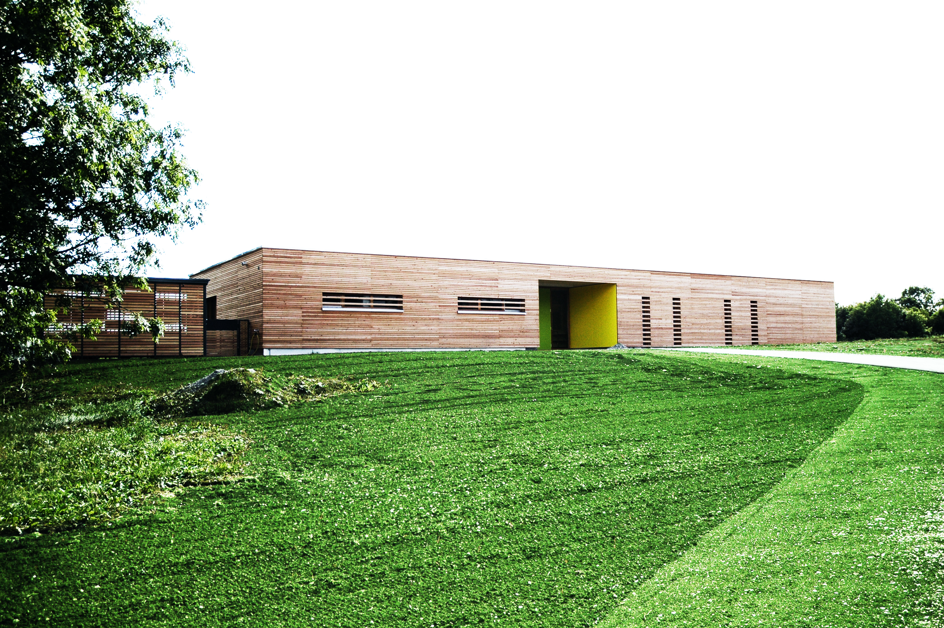 Der eingeschossige kompakte Baukörper wurde als Holzkonstruktion in mehrschichtigem Kreuzlagenholz erstellt, mit sichtbaren Holzoberflächen der Wände und Decken in allen Innenräumen. Die massiven Außenwände erhielten als abstrakt stilisierte „Wald-“ Fassade eine frei bewitterte hinterlüftete Holzverkleidung.