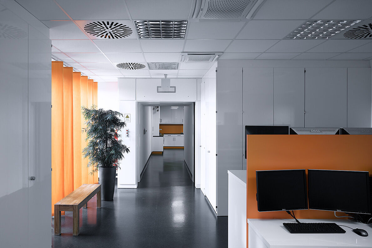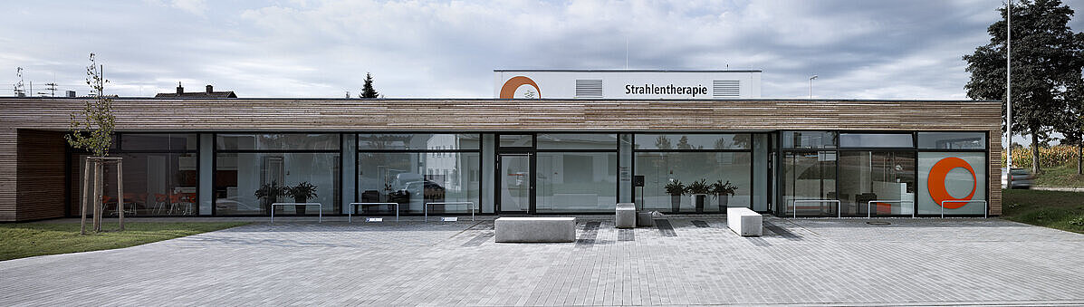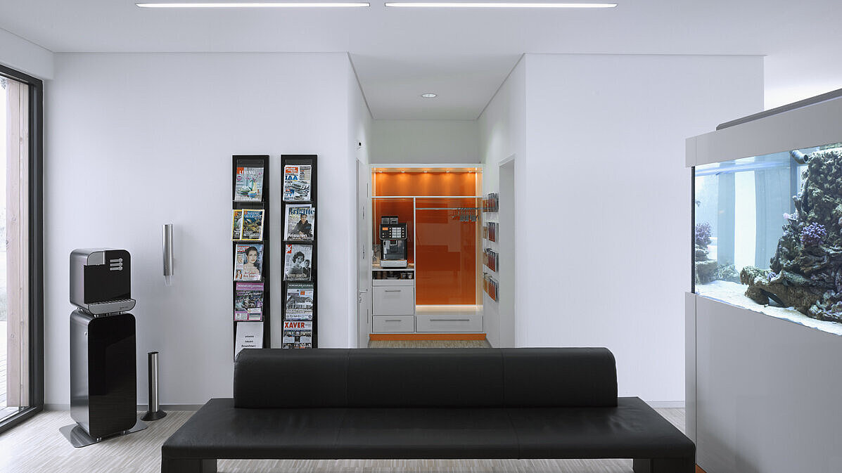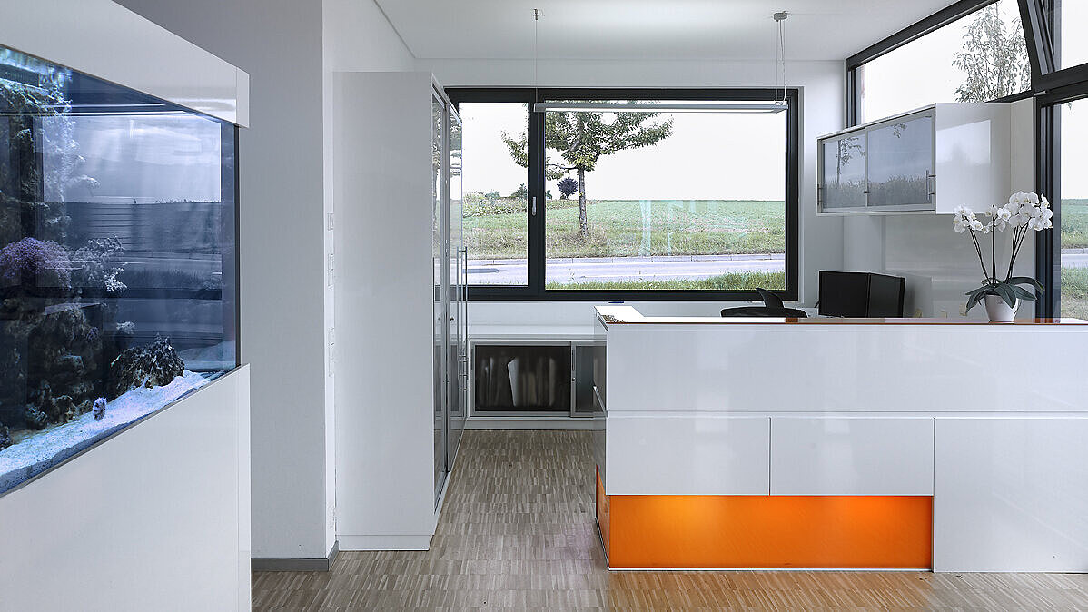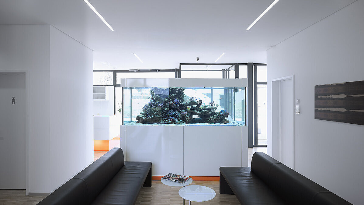 Die Räume der Praxis wurden nicht wie eine typische Strahlentherapie oder Klinik gestaltet. Viele der Patienten müssen sich über einen längeren Zeitraum hin täglich behandeln lassen. Die großzügige Verglasung sowie der helle Parkett sorgen bei dem eingeschossigen Flachdachgebäude somit für eine Wohlfühl-Atmosphäre. Ein großes Meerwasser-Aquarium dient im Empfangsbereich als Blickfang. Dahinter liegt der behagliche Wartebereich mit Zugang zur Terrasse im Grünen.