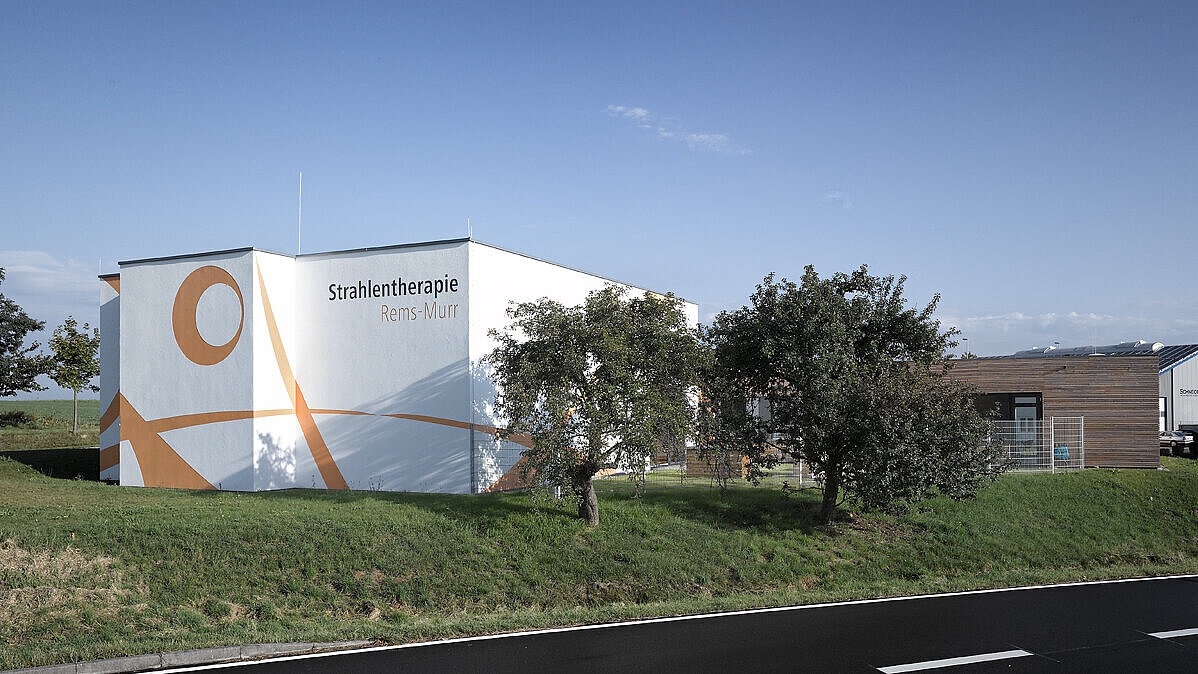 Der Neubau der Strahlentherapiepraxis befindet sich im Gewerbegebiet in Winnenden. Sie gliedert sich in zwei Bereiche: dem Praxisbereich und dem Bunker mit Linearbeschleuniger und angrenzendem Schaltraum / Haustechnik. Direkt an den Empfang und Wartebereich sind die Behandlungs- und Untersuchungsbereiche angeknüpft, um einen strukturierten und übersichtlichen Behandlungsablauf zu Gewährleisten. Auf Grund der Topographie des Grundstücks war es möglich, ohne große Geländemodulationen einen barrierefreien Zugang zu ermöglichen. Für Liegend kranke Patienten wurde ein separater Eingang errichtet.