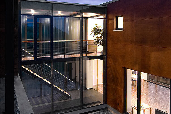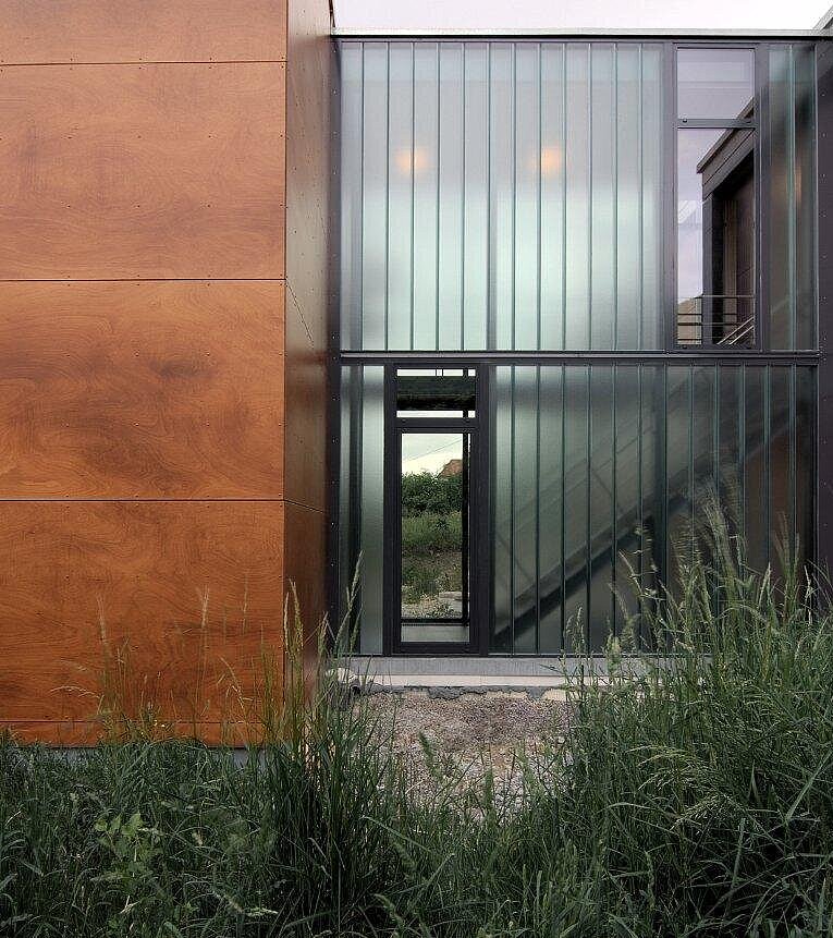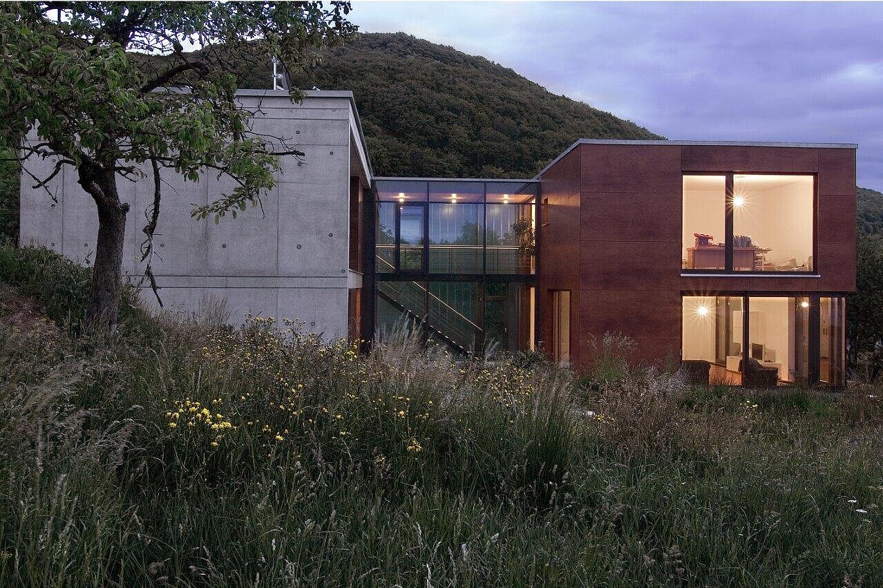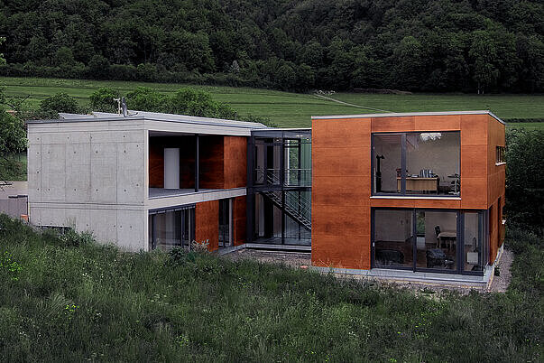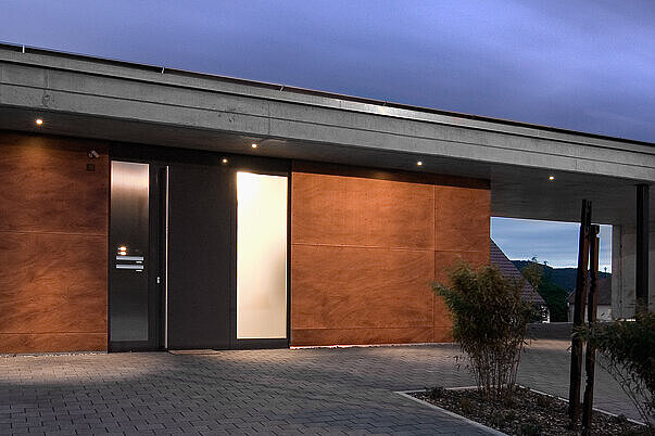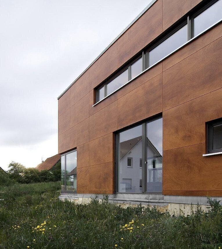 Besonders positiv aufgenommen wurde das Projekt von der örtlichen Baubehörde – nicht zuletzt wegen seines klaren, modernen Materialkonzepts. Die Kombination aus Schichtholz-Fassadenplatten und Sichtbeton fügt sich selbstverständlich in die umgebende Landschaft ein und schafft einen ruhigen, authentischen Ausdruck. Das Wohnhaus vereint damit zeitgemäße Architektur und ortsbezogene Gestaltung zu einem stimmigen Gesamtbild, das sich harmonisch in die dörfliche Struktur einbettet.